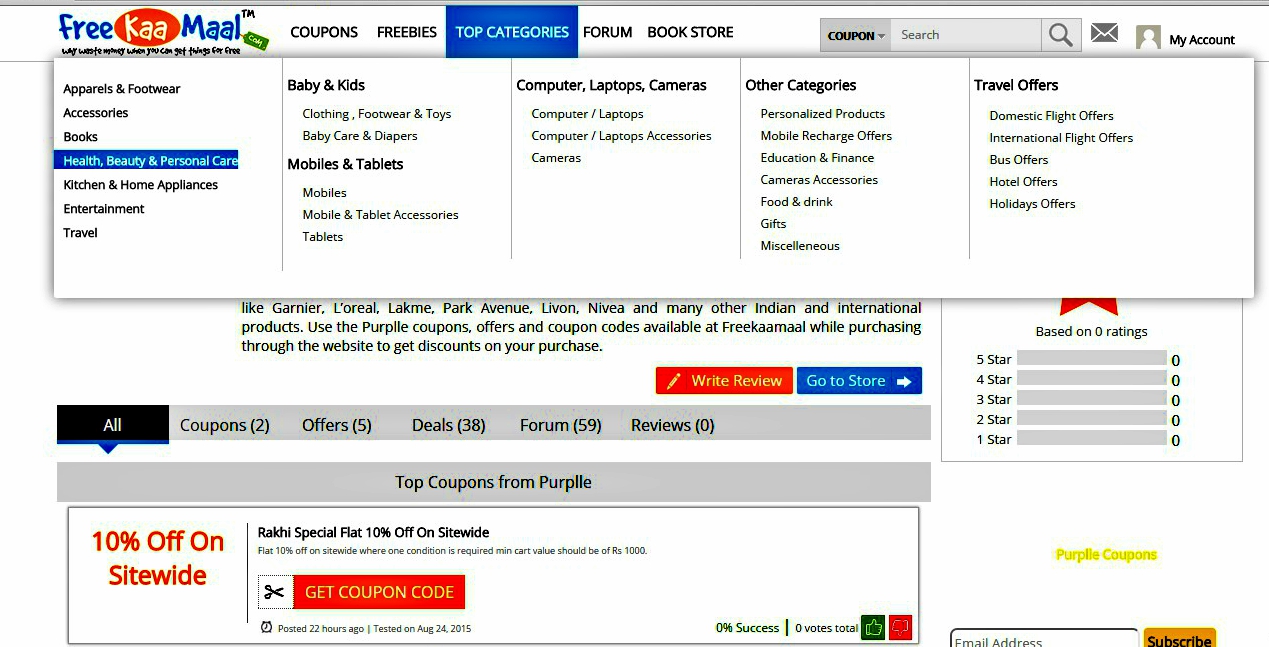 If you are looking out for deals in a specific category for example beauty products, click on the Top categories and you will find it. I was checking out for deals in beauty products, Purplle coupon code caught my attention - they have flat 10% off sitewide, beauty products fans don't miss this offer.