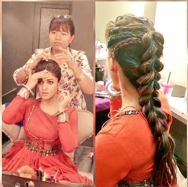 Nayanthara replaced the boring braids by braids with side swept partition. She has achieved this look by loosening up the braids and leaving a few strands of hair at the sides of the hairline.